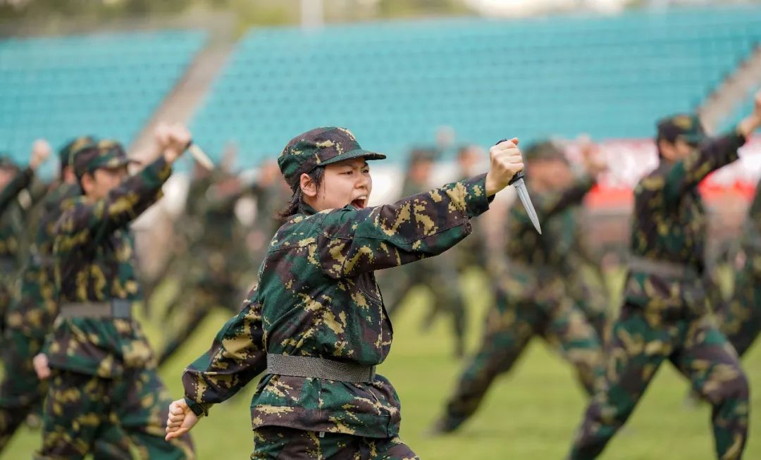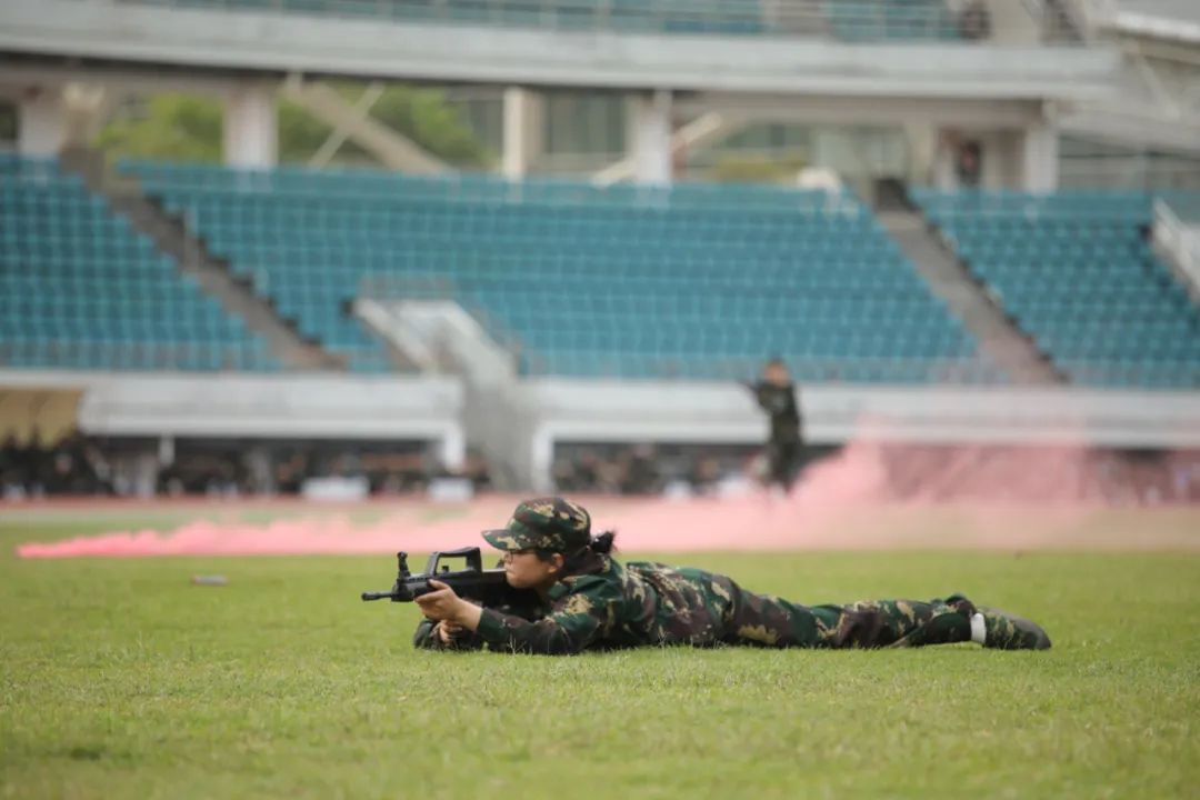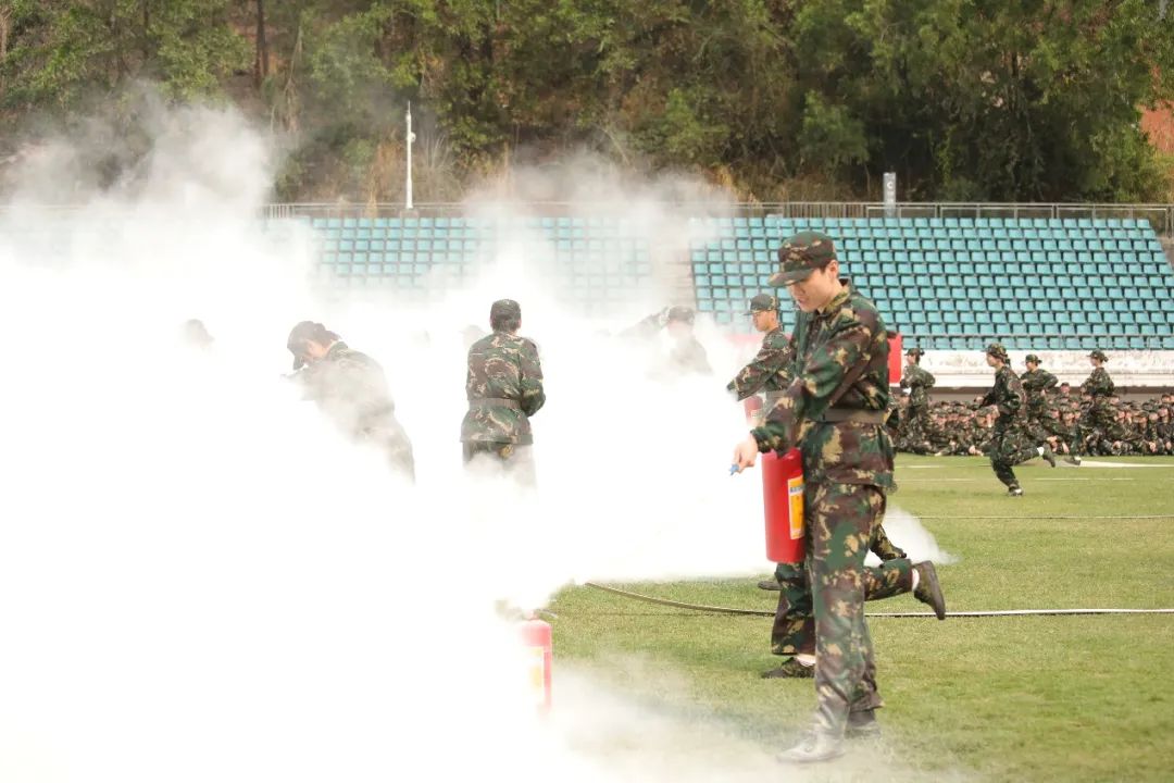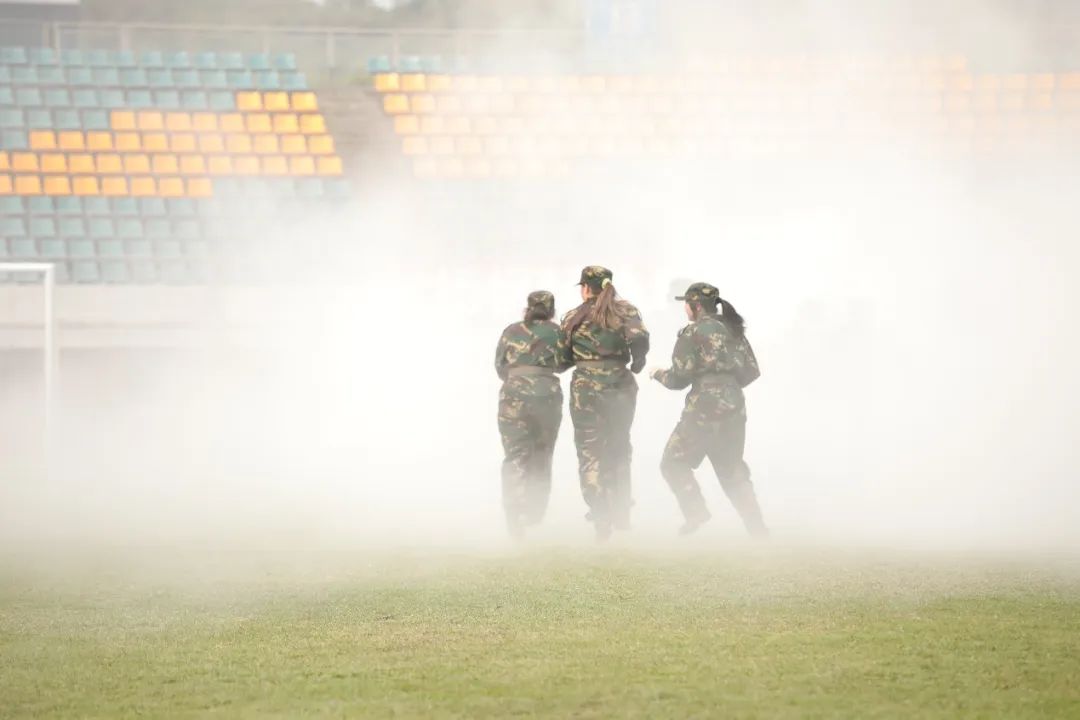 国歌起,斗志燃,军训汇演开始。“严格训练,严格要求。请党放心,强国有我……”分列式展示中,同学们步履铿锵,喊出响彻云霄的时代之音。擒敌拳展示一招一式刚劲有力,绊腿抡摔、格挡勾拳尽显浩然之风。应急棍术展示节奏分明、攻防兼备,同学们收放自如,斗志昂扬。匕首操展示“霸气”亮相、气势如虹、刚柔并济。消防演习中,同学们各司其职、井然有序、安全“逃出火海”。战术展示环节,大家动作精炼、反应敏捷,在摸爬滚打中练就“实战”本领。军体拳展示口号声声、激昂奋进、整齐划一。熟悉的歌曲《国家》响起,校区学子用手语操祝福伟大祖国繁荣昌盛……