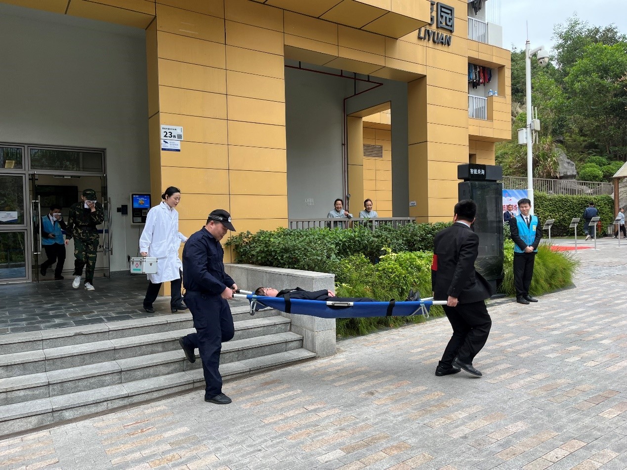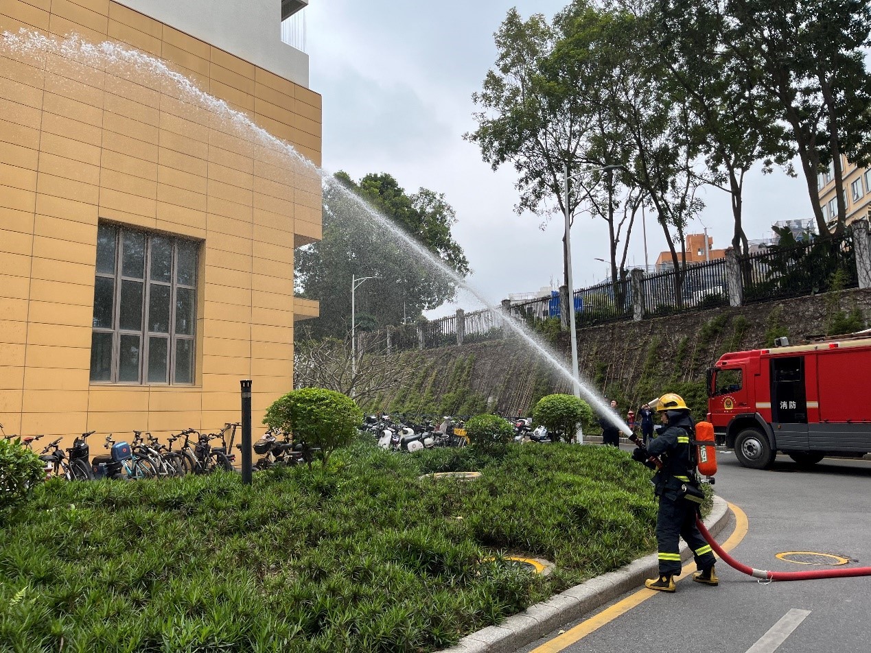 本次演练模拟荔园6栋学生公寓某宿舍发生火灾,在消防控制室接到火灾报警信号后,现场人员立即拨打119报警。校区立即启动校园火灾事故专项应急预案,成立现场应急救援指挥部。灭火组、疏散组、救护组、警戒组和设备组按照预案开展救援疏散,宿舍学生在工作人员的指引下有序撤离至室外安全区域,各应急救援小组与南山区消防救援大队密切配合,最终安全灭火。