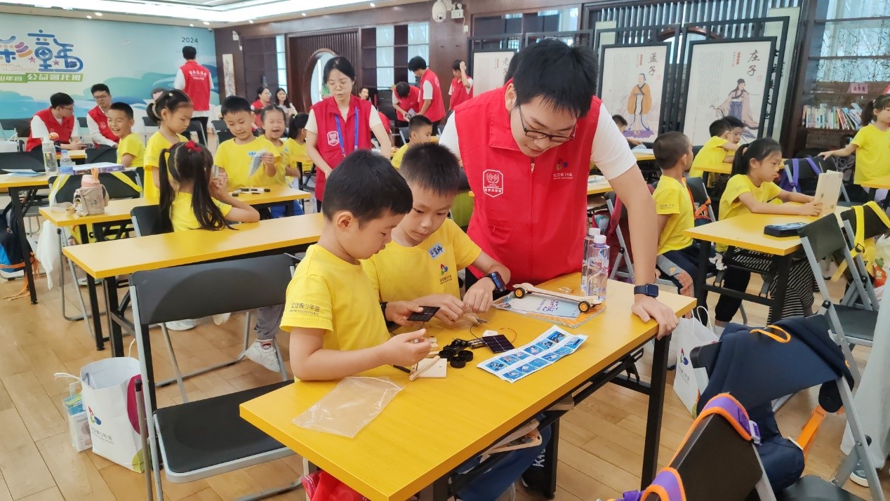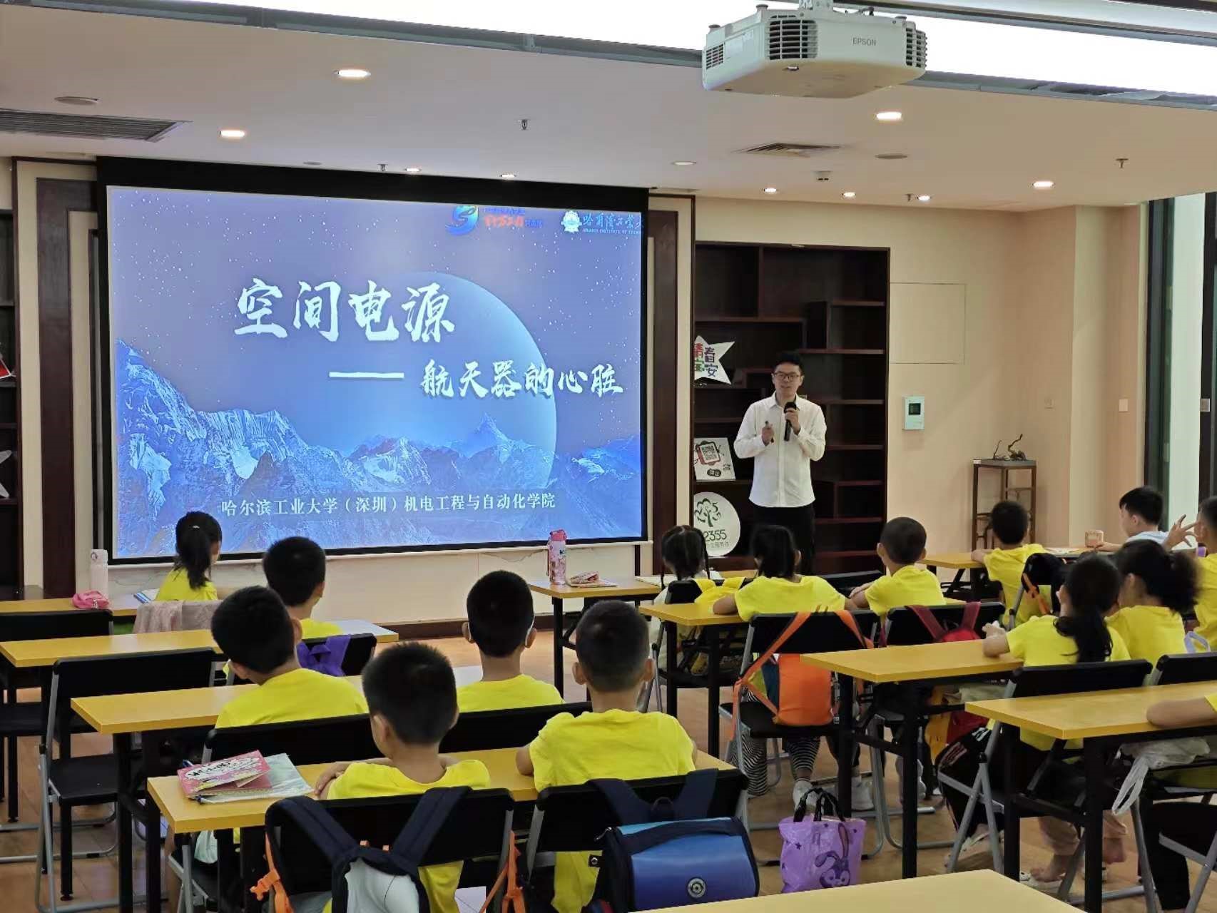 【哈工大(深圳)宣】(汪中培 余江水 杨慧舒 汤帅/文 杨振昕 汤帅/图)7月19日,机电工程与自动化学院“红心铸魂,逐梦星辰”学生党员实践重点项目团队携手“博学知行”突击队来到宝安区青少年宫,以“空间电源科普知识”为主题,向广大青少年传递“科研火种”,充分展现了哈工大学子的青春风采。