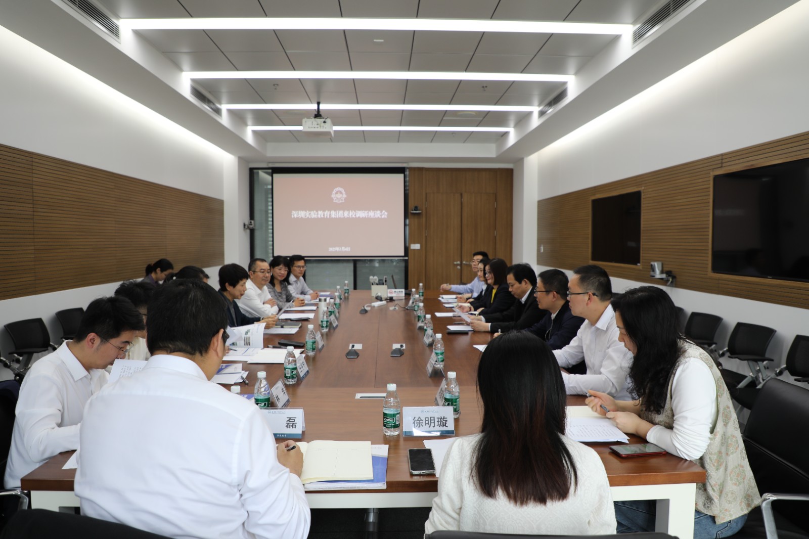 【哈工大(深圳)宣】(向碧霞/文 施冉/图)3月4日,深圳实验教育集团党委书记夏育华率队来到哈工大深圳校区,围绕大中小学思政教育一体化建设展开调研。哈工大深圳校区党委副书记张国宏,党委副书记、纪委书记戴纪锋与调研组一行座谈交流。