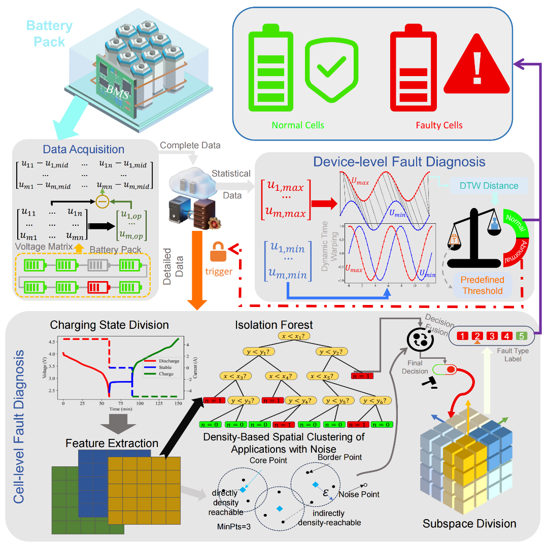 针对上述难题,董广忠教授课题组提出了一种基于无监督学习的双层云诊断框架。该方法首先在设备层通过动态时间规整距离对电池组的电压包络序列进行快速异常筛查,实现百万级设备的毫秒级筛选(平均每设备仅2.7毫秒);随后在电芯层,对异常设备采用“孤立森林+DBSCAN”两阶段聚类以分离出正常-异常电芯簇,针对异常电芯,分析所提取特征分布与电池动态行为关系,构建基于规则的详细故障类型定位机制,精准识别微短路、低容量、高SOC、低SOC四类故障,可在稀疏运行数据中高效定位故障类型。在包含超过12.8万个真实设备的大规模数据集上验证,设备层诊断准确率达97.33%,电芯层准确率高达99.66%。团队进一步对算法诊断为“低容量”和“微短路”的电池进行实验室召回验证:低容量电池实际容量(约15.54 Ah)显著低于正常电芯(约17.58 Ah),微短路电池充电容量(8.55 Ah)明显高于放电容量(7.99 Ah)且静置后容量显著下降,证实了诊断结果的准确性。