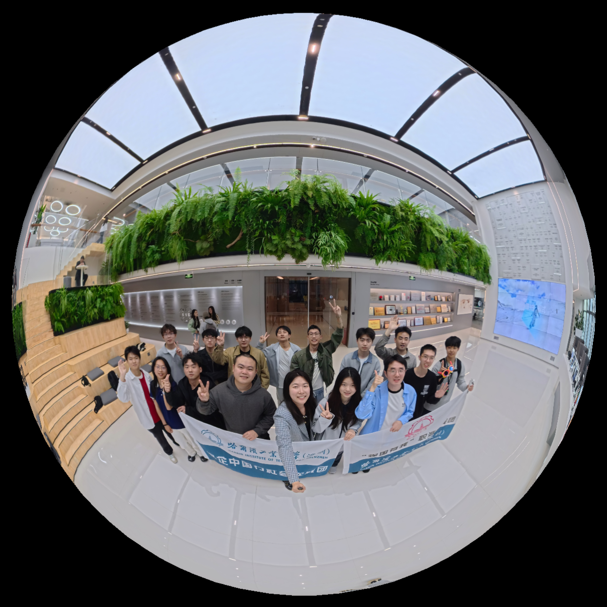 3月9日下午,企业接待负责人向实践团全面介绍了影石的发展历程、产品迭代历程、“Think Bold”(敢想敢为)的理念,系统展现了企业在全景影像领域的技术积淀与创新突破。在互动体验环节,成员们佩戴可呈现无人机视角的智能眼镜,沉浸式感受前沿影像科技带来的新奇视觉体验。负责人还使用全景相机为实践团拍摄创意全景合影,生成“小行星”、“水晶球”等有趣的视觉效果,让同学们纷纷赞叹。