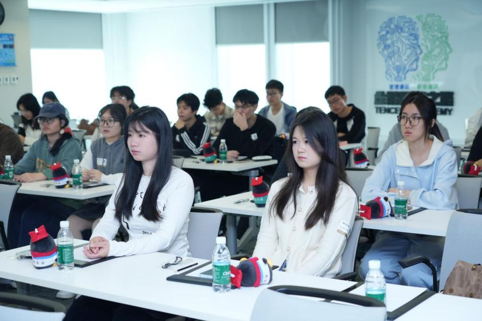 参观环节结束后,腾讯集团华南地区校园招聘负责人围绕2026年校招信息展开深度分享。同学们对互联网行业的职业生态有了立体认知,也对自身发展路径有了更清晰的规划锚点。随后,腾讯青科实训营特邀讲师为同学们带来了以“AI大模型浪潮”为主题的专题讲座,系统讲解了大模型的技术原理、训练逻辑、应用场景及未来前景。讲座现场互动氛围热烈,同学们结合自身专业学习实际,围绕技术难点、行业趋势等话题与讲师展开深入对话,在思想的碰撞中拨开技术迷雾、点亮知识盲区。