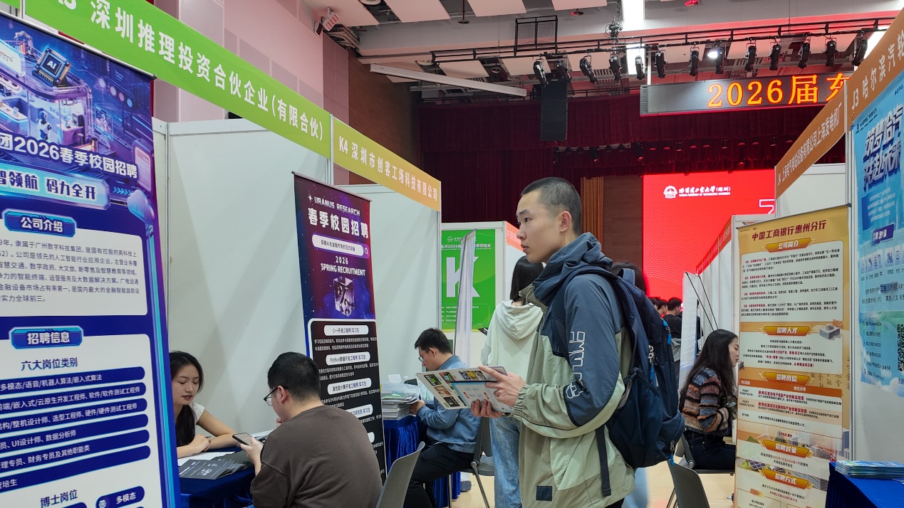 【哈工大(深圳)宣】(张韶琛/文 谢梁晖 苗俊丰/图)3月18日,东北五校2026届毕业生春季双选会在哈工大深圳校区师生活动中心举行,来自航天国防、智能制造、互联网信息、科研机构、建筑等领域的101家单位携超过3万个岗位向青年学子伸出“橄榄枝”,为助力毕业生实现高质量充分就业搭建良好平台。校区领导张国宏、戴纪锋、吕宏振前往双选会现场与用人单位及毕业生代表交流。