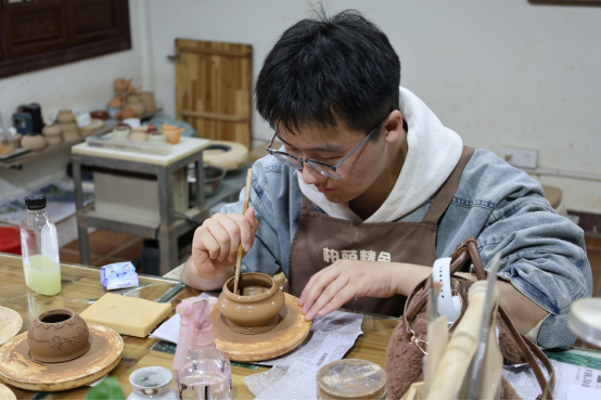 研学最后,师生们沉浸式体验国家级非遗项目——潮州手拉朱泥壶制作。非遗传承人现场展示手拉壶制作技艺,随着拉坯机缓缓转动,陶泥在她手中迅速塑形。“每个细节都关乎成败,制作讲究‘失之毫厘,差之千里’,手稳心沉,缺一不可。”在传承人悉心指导下,大家纷纷尝试亲手拉坯、塑形,感受泥料在指尖成型的独特乐趣,体悟“潮州人做工夫”所蕴含的专注与坚守。通过动手实践,师生们更加深刻理解,非遗传承需要青年一代接力赓续、守正创新。