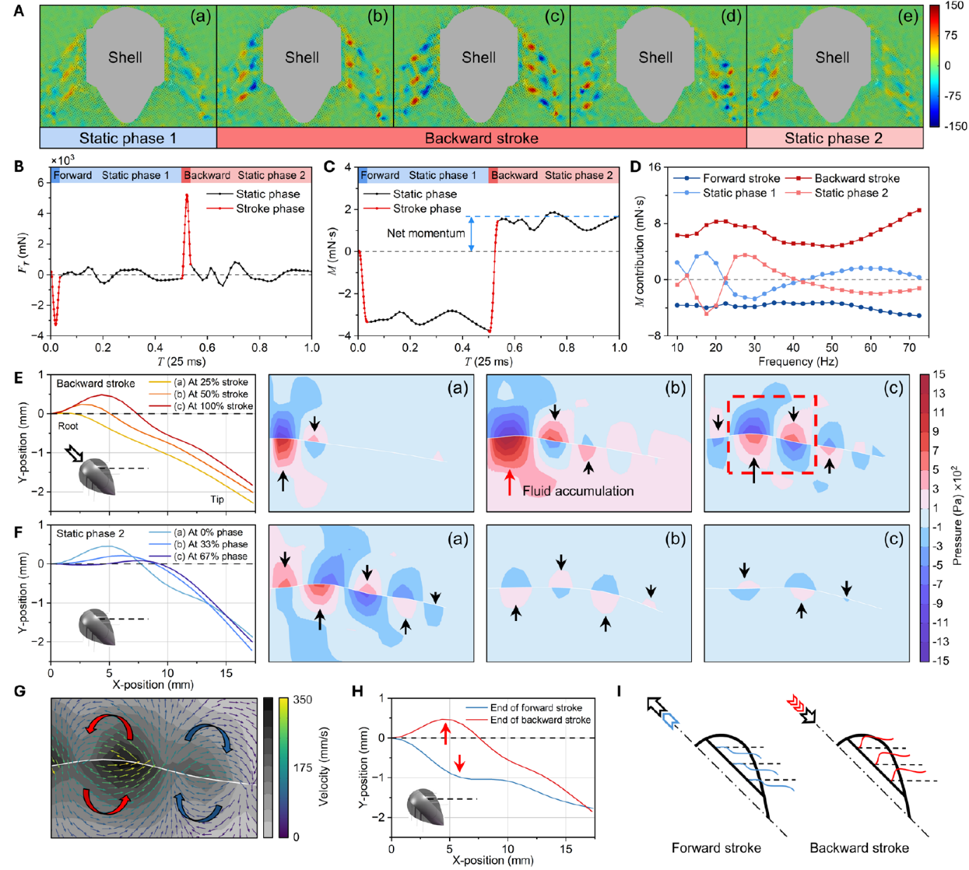 团队针对水中运动机理展开深入研究,进一步揭示了推力产生的瞬态流体动力学机理。如图2所示,通过粒子图像测速(PIV)与数值模拟系统揭示了水下推进的瞬态动力学过程。在30 Hz振动条件下,后冲程阶段鳍片周围产生交替符号的强涡结构(>150 s⁻¹),并沿鳍片由根部向末端传播,而两个静止阶段的涡强度明显减弱(<60 s⁻¹)。这表明主要动量交换集中发生在前、后冲程阶段。进一步对单周期推力与动量进行分析可见,冲程阶段产生显著的正负推力峰值(-3.38与+5.14 mN·s),而静止阶段贡献基本相互抵消;不同频率下的动量分解结果进一步证明,净推进力来源于前后冲程之间的不对称动量差。压力场与鳍片形变结果显示,在后冲程中鳍片张开、流体在根部形成更大的聚集区,从而产生更高局部压力与正向推力;而在前冲程中鳍片收缩以减小阻力。这种由结构倾斜与弹性形变共同导致的流固耦合非对称性,构成了“惯性驱动多方向推进”(IDMP)的物理基础,使机器人仅通过调节振动频率即可实现直行与转向切换。