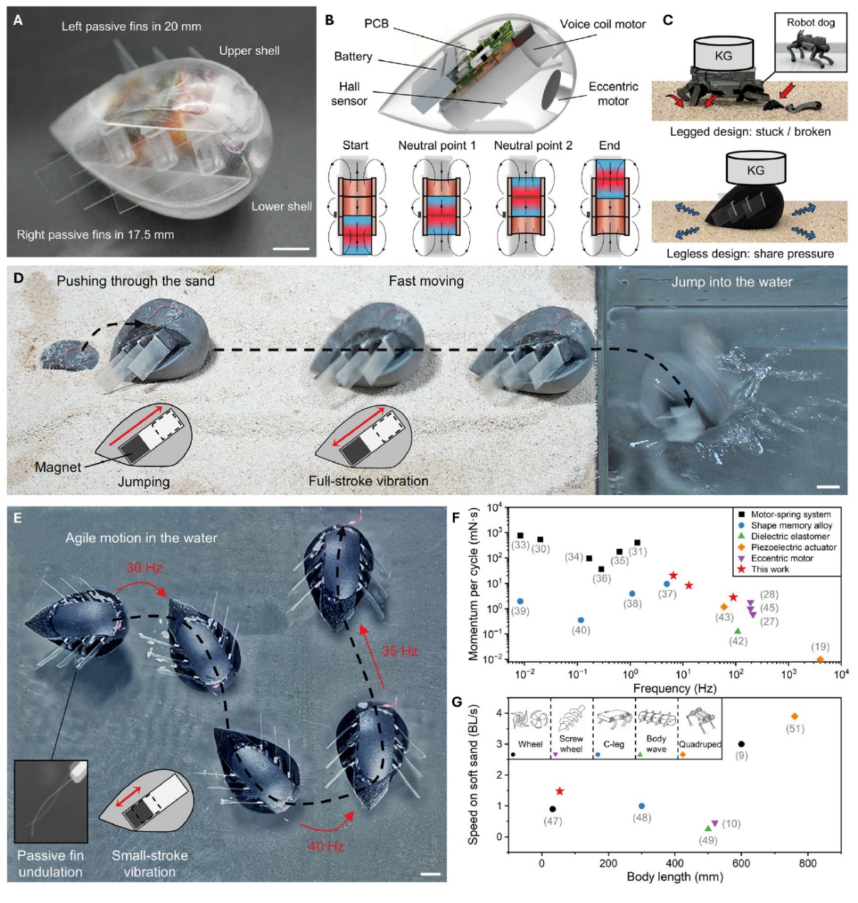 【哈工大(深圳)宣】(智能学部 文/图)近日,哈工大深圳校区机器人与先进制造学院李兵教授、李曜教授团队在微小型机器人领域取得重要进展,提出了一种基于惯性驱动的无腿式两栖机器人设计方法,在厘米尺度实现了陆地爬行、连续跳跃与可控转向游动等多模态运动,为微型水陆两栖机器人提供了全新技术路径。相关研究成果以“Inertia-driven amphibious robot with asymmetric microundulatory fin arrays”为题发表在国际权威期刊《Science Advances》,哈工大深圳校区为论文第一完成单位,合作单位为香港中文大学。
