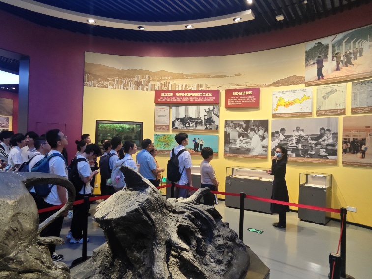 展览以时间为主线,通过照片、实物、视频、模型、场景复原及高科技互动体验,立体再现了改革开放精神在南粤大地的生动实践。正是凭借敢为天下先的担当和锐意进取的探索精神,广东从一个经济落后的边陲省份,一跃成为全国第一经济大省。作为改革开放的排头兵、先行地和实验区,广东40余年的发展历程有力印证了“发展才是硬道理”这一朴素而深刻的真理。学员们认真聆听讲解员讲述经济特区的创办历程,切身感受改革开放以来敢闯敢试、创新引领的时代脉动。